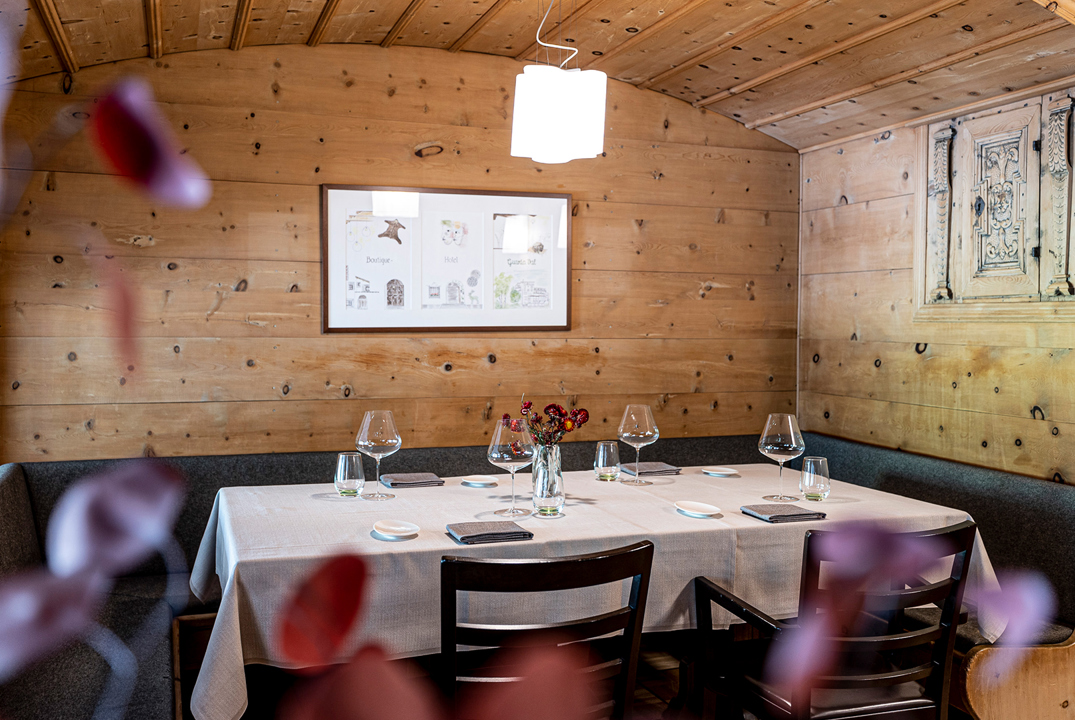 In winter 2013, we began to break new ground in our restaurant in GuardaVal. The house is the epitome of the way the Engadine is built and thus also a symbol of tradition, unspoiltness and living with the forces of the mountain world that surrounds us. The cuisine also reflects the reduction to what nature gives us. The purity of the products, the effort of preparation and the ever-changing scent of vegetables, stews, preserves and sweets is what takes centre stage.