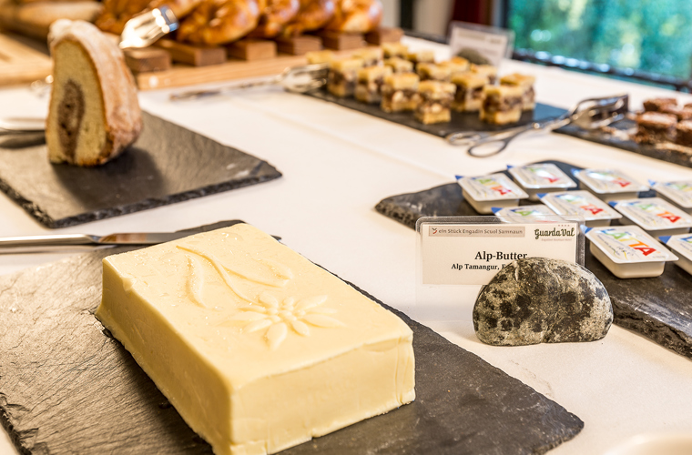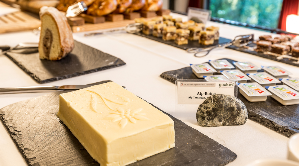 Enjoy our alpine gourmet breakfast every morning. Spread your bread from the local baker with the best butter from the region, plus some honey from the beekeeper in Scuol - most of the food on our breakfast buffet is produced in the local area. Dishes with fresh eggs from Sent are prepared upon order by our kitchen team. Some hearty alpine cheese and a few slices of Salsiz from the village butcher - so you start the day with the best energy.